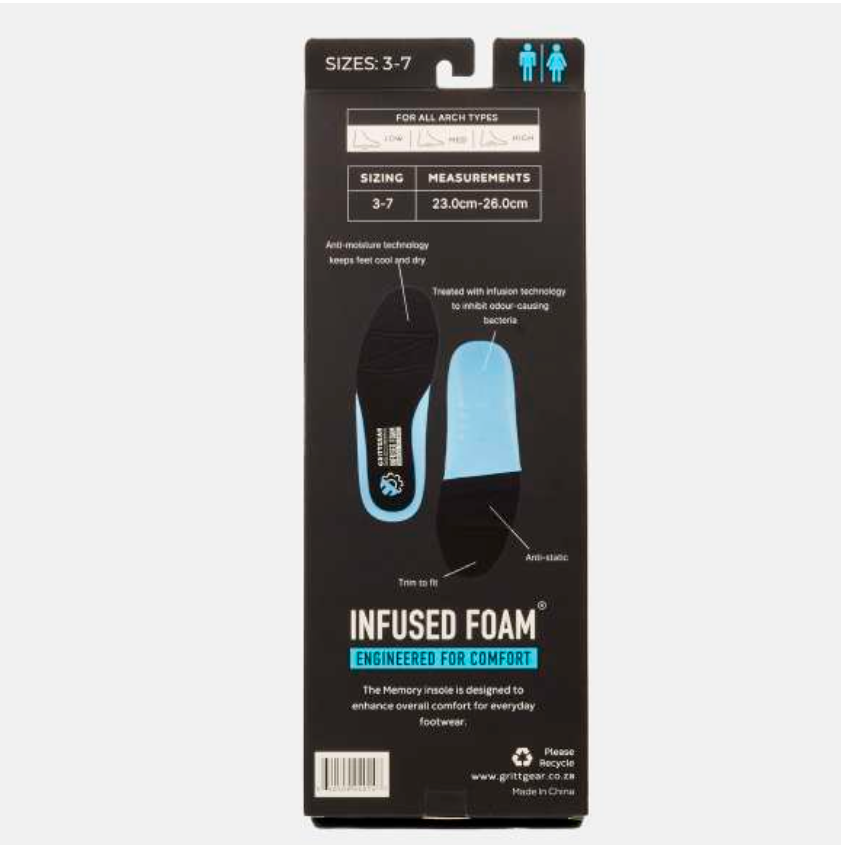 Insole: Infused Foam™️; Removable Anti-Bacterial Sock